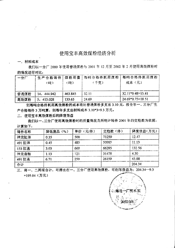 4)在型砂中,由于高效煤粉的补加量少于普通煤粉平均约35%。若以生产单位质量合格铸件耗用煤粉计算,考虑到使用高效煤粉在降低铸件废品率方面所起的积极作用。高效煤粉的综合用料成本低于普通煤粉。另外,使用高效煤粉,由于大量减少了煤粉的耗用量,每年节约的材料运输和仓储费用也相当可观。